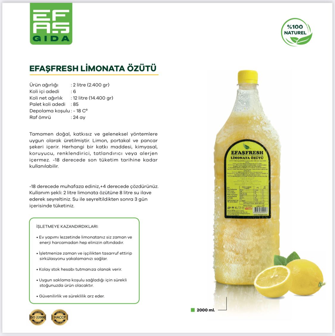 Kullanım şekli : 2 litre limonata özütüne 8 litre su ilave ederek seyreltiniz.