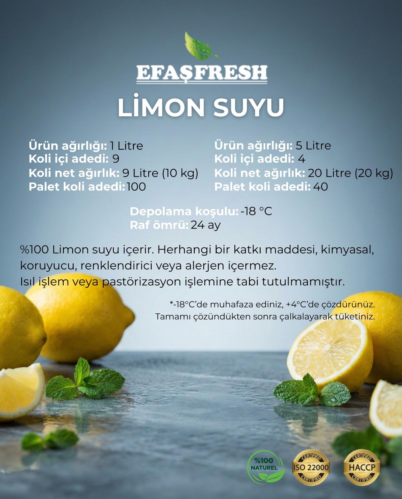 % 100 Limon suyu içerir. Herhangi bir katkı maddesi, kimyasal, koruyucu, renklendirici, tatlandırıcı veya Alerjen içermez. -18 derecede son tüketim tarihine kadar kullanılabilir.
