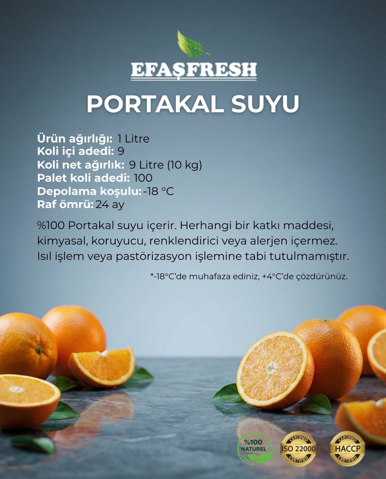 % 100 Portakal suyu içerir. Herhangi bir katkı maddesi, kimyasal, koruyucu, renklendirici, tatlandırıcı veya Alerjen içermez. -18 derecede son tüketim tarihine kadar kullanılabilir.